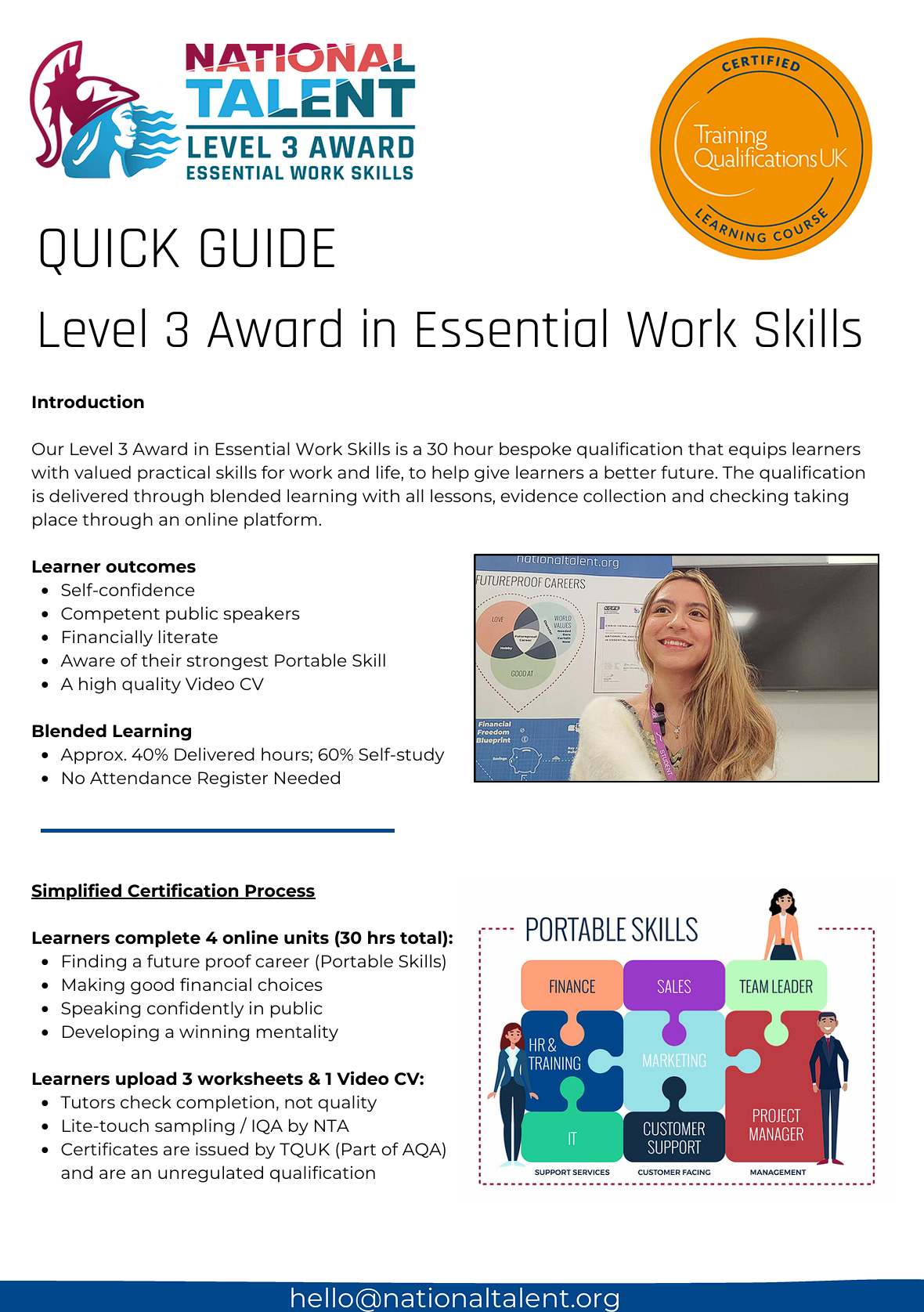 Thank you for your interest in becoming a delivery partner for the National Talent Level 3 Award in Essential Work Skills. This page contains the following materials to watch, download, read and share: